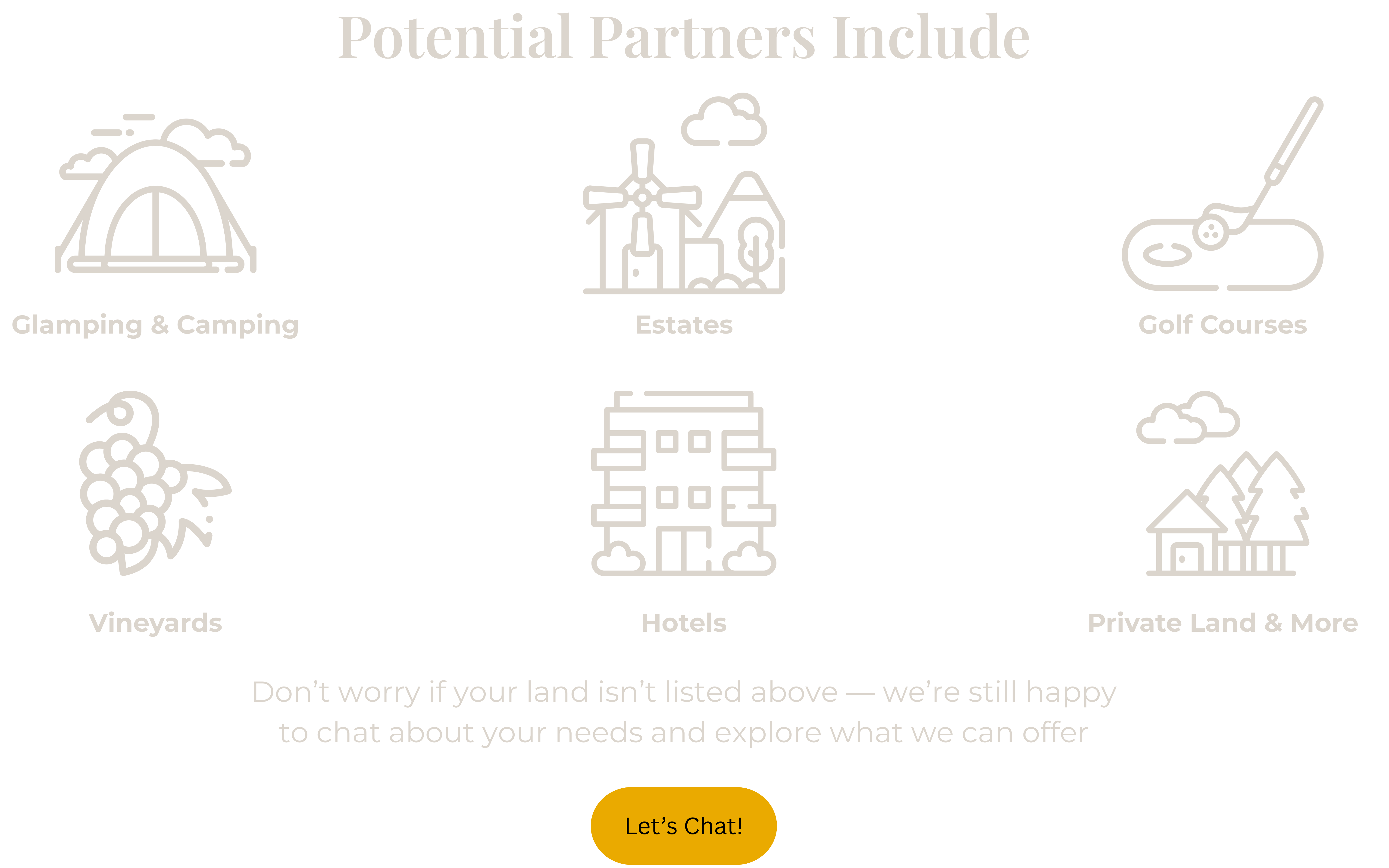 Partner with Tree Tents and transform your land into a captivating, eco-friendly destination. Whether you're looking to diversify income, enhance guest experiences, or develop a sustainable retreat, our team is here to guide you every step of the way. With our innovative structures, industry expertise, and commitment to low-impact design, we help landowners create unforgettable spaces that align with nature and attract adventure-seekers, glampers, and wellness travellers alike. Let’s work together to bring your vision to life. Get in touch today to explore the possibilities.