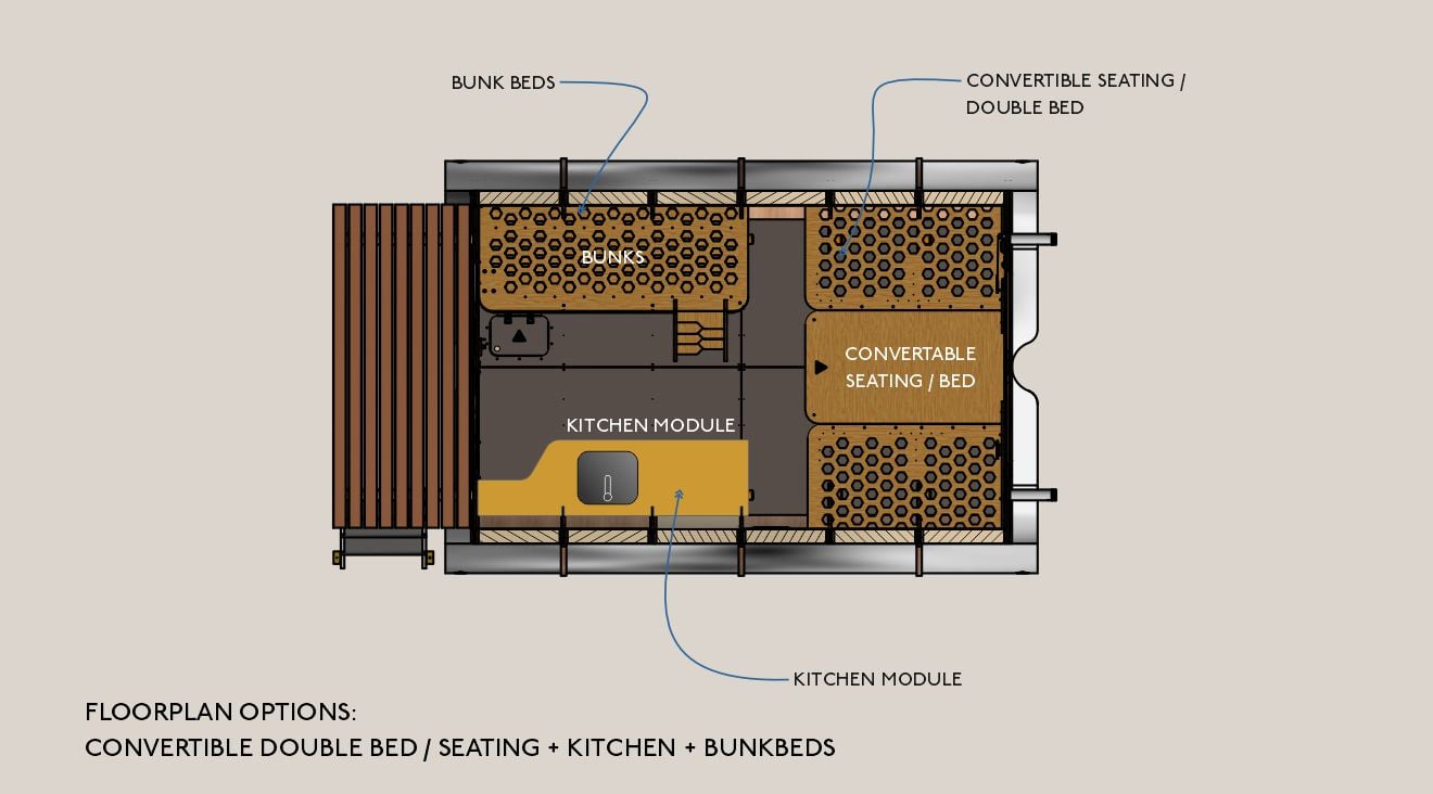 The Fuselage is designed and built using materials lightweight enough to allow it to be suspended or mounted on stilts – making it suitable for any terrain or range of challenging conditions. The Fuselage uses sustainably sourced wood and recycled aluminium to achieve an eco-friendly and robust structure.