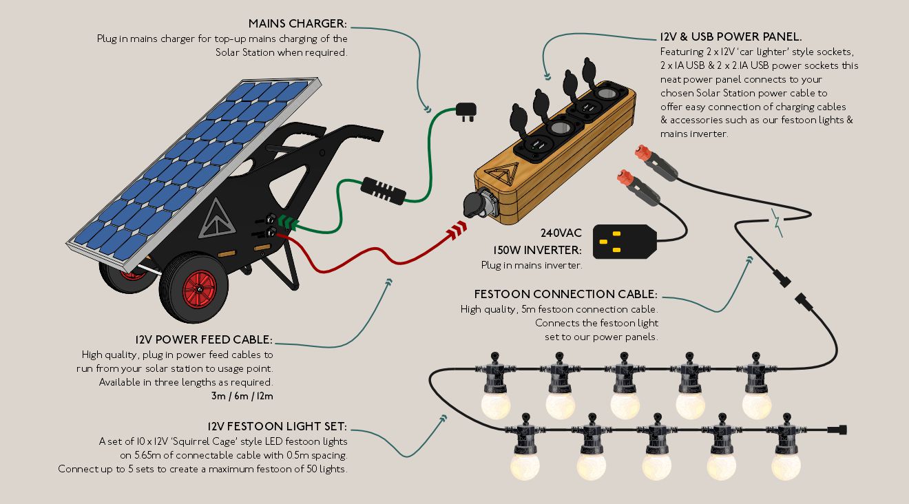 The great thing about our solar station is that its very mobile! As such, when power demands become too high and the suns not playing ball then it can be easily moved back to the workshop, house or nearest mains electric point, plugged in and charged back up ready for your next guests. Using mains power, it usually takes about 24 hours to get things back to full charge.
