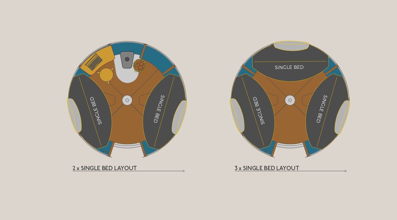 This is luxury, wild style. The Tree Tent gives any outdoor space the 'wow' factor. The pod itself is meticulously laid out with bespoke beds, windows, a desk, underfoot storage, dimmable ring lighting and a large circular skylight.