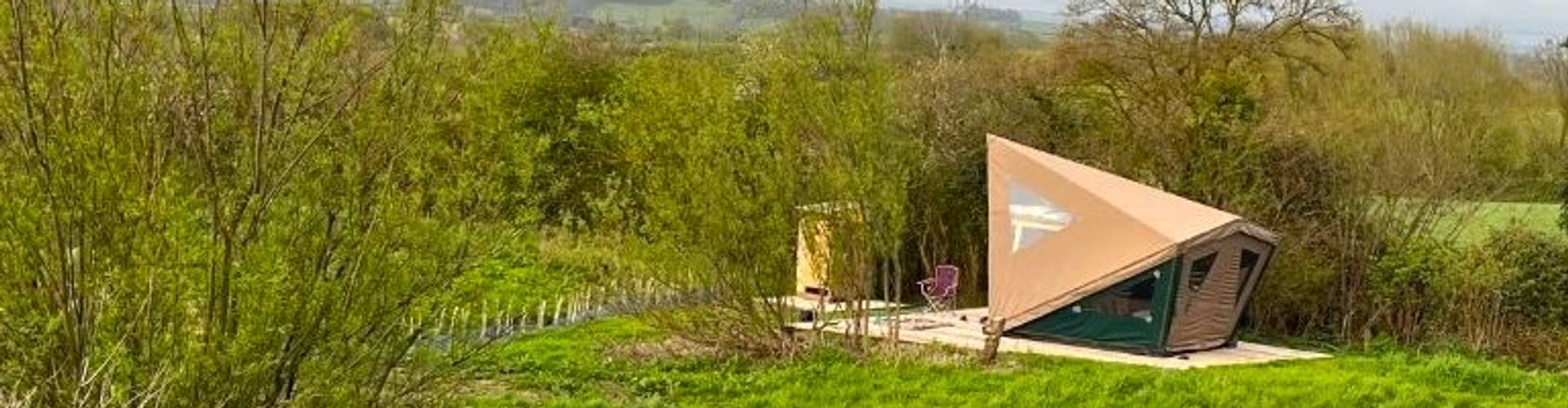 From your tent, enjoy sweeping views across Marshwood Vale toward Pilsdon. Although completely off the grid, the space includes a solar panel system to supply tent lighting. Cars are parked just across the pond, and we provide a trolley to help you transport your luggage.