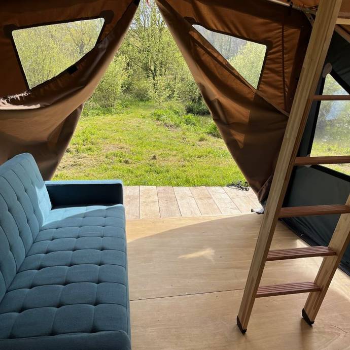 Built in April 2024, Pond Hideaway is a one-of-a-kind off-grid canvas tent nestled beside the Secret Pond, just a three-minute walk from the main barn. Suspended 2 m above the ground in the trees, the mezzanine bed provides a magical perch, while a sofa bed ensures comfortable sleeping arrangements for a family of four (2 adults + 2 children).