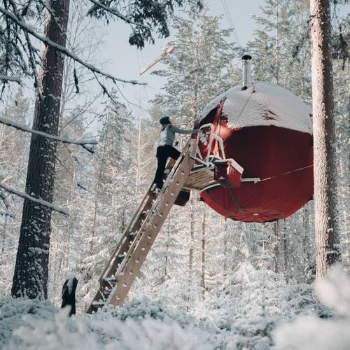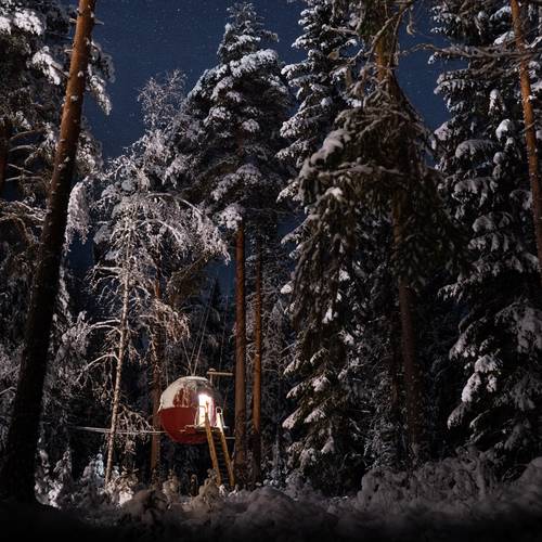 In a big red moon, cradled among the trees! a Treehouse in Sweden. Comfortably enjoying nature from a height of 3 meters. That is possible in the Supermåne (Swedish for Supermoon). From here, you can see a moose grazing under your hut. And in the evening, you look right through the dome window into the starry sky, with a chance of northern lights from your treehouse.