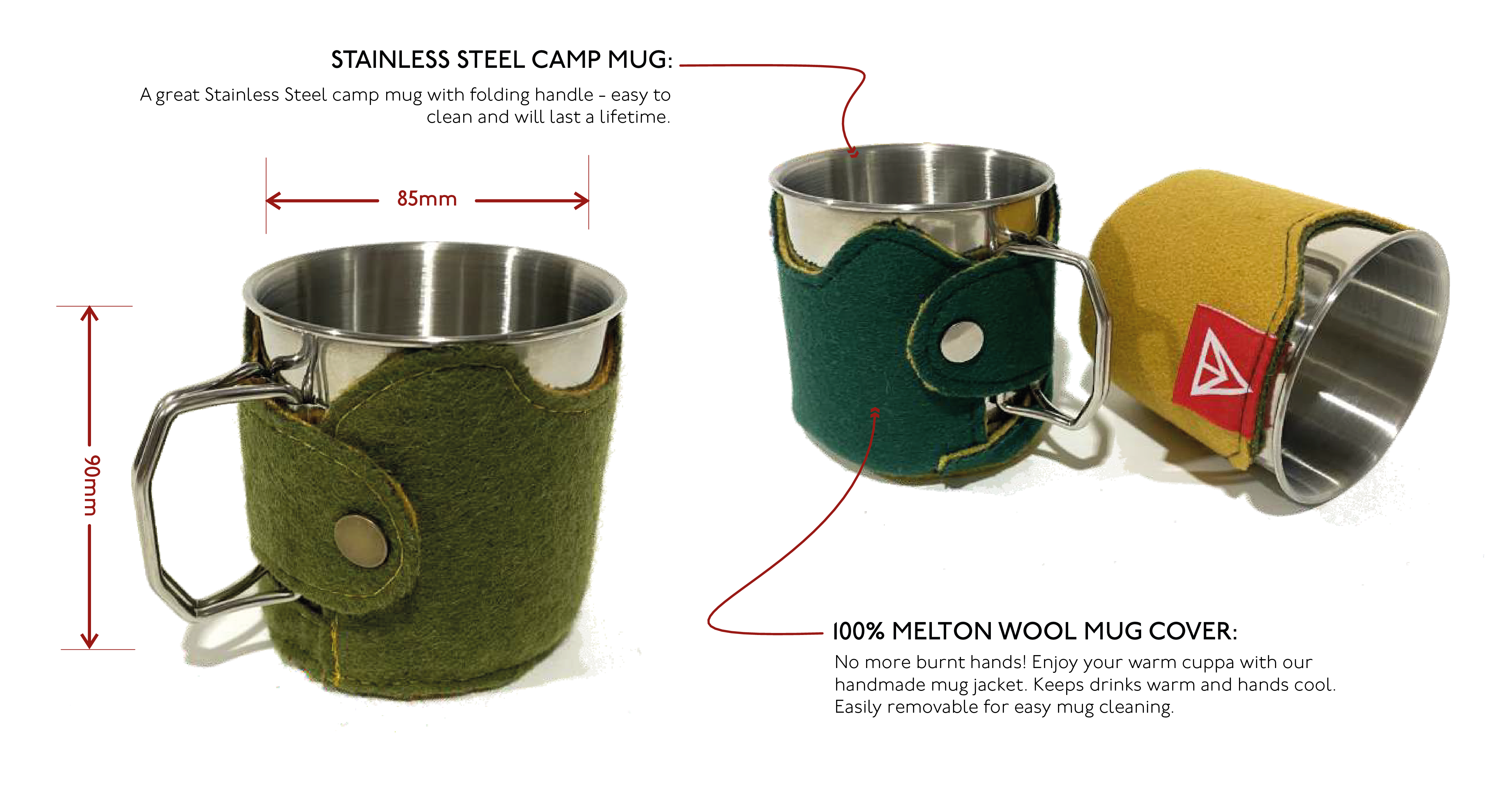 Our insulated camping mugs are made from 305 stainless steel, and are built to last. Easy to clean, corrosion resistant, hygienic and light, teamed with a 100% wool insulated cover, hand sewn in our Sussex workshop.