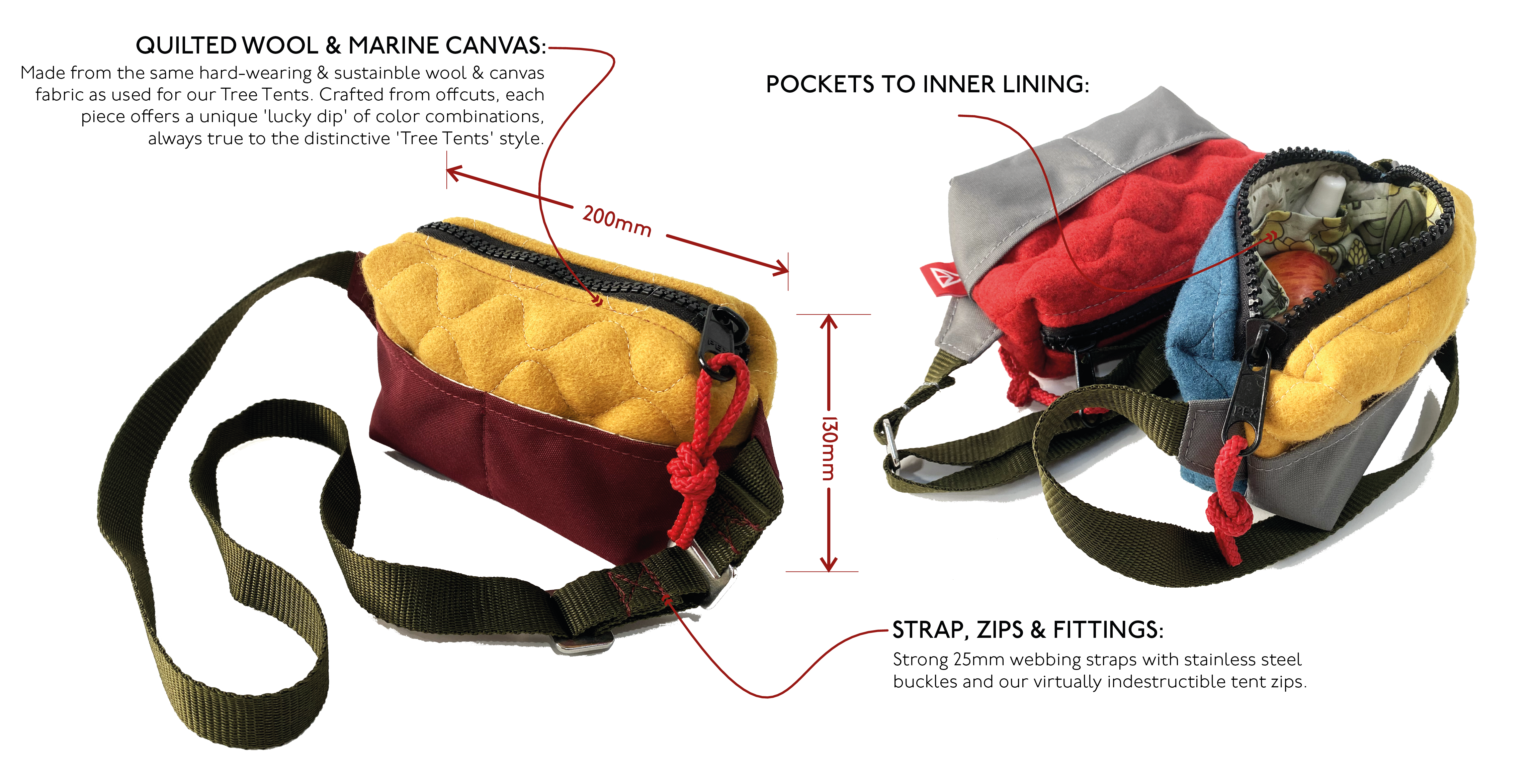 The Tree Tents hip pack come in the same complementary variety of colours as our outdoor structures. However, due to the nature of these offcuts, the colourway of your bag will be a lucky dip!
