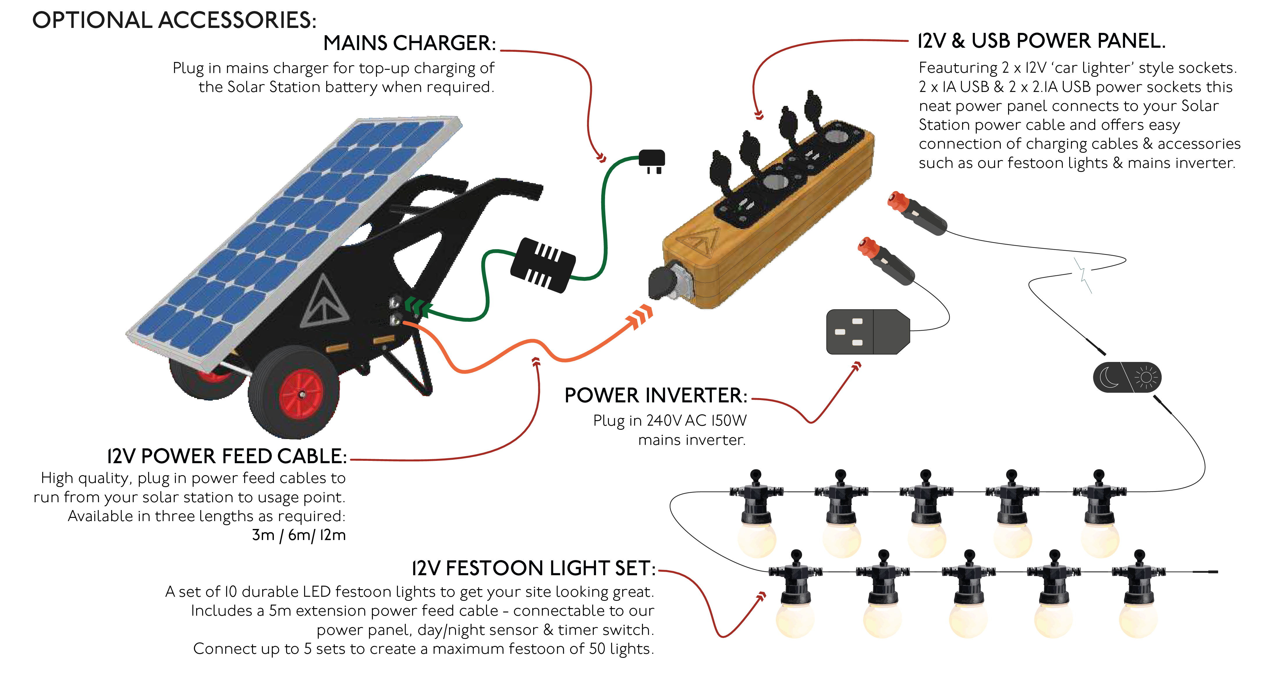 The perfect solution to off-grid power, the Solar Station and it's accessories are great for a set up with low-wattage items, such as charging a laptop, running festoon lighting, or small 12v or lower electricals.