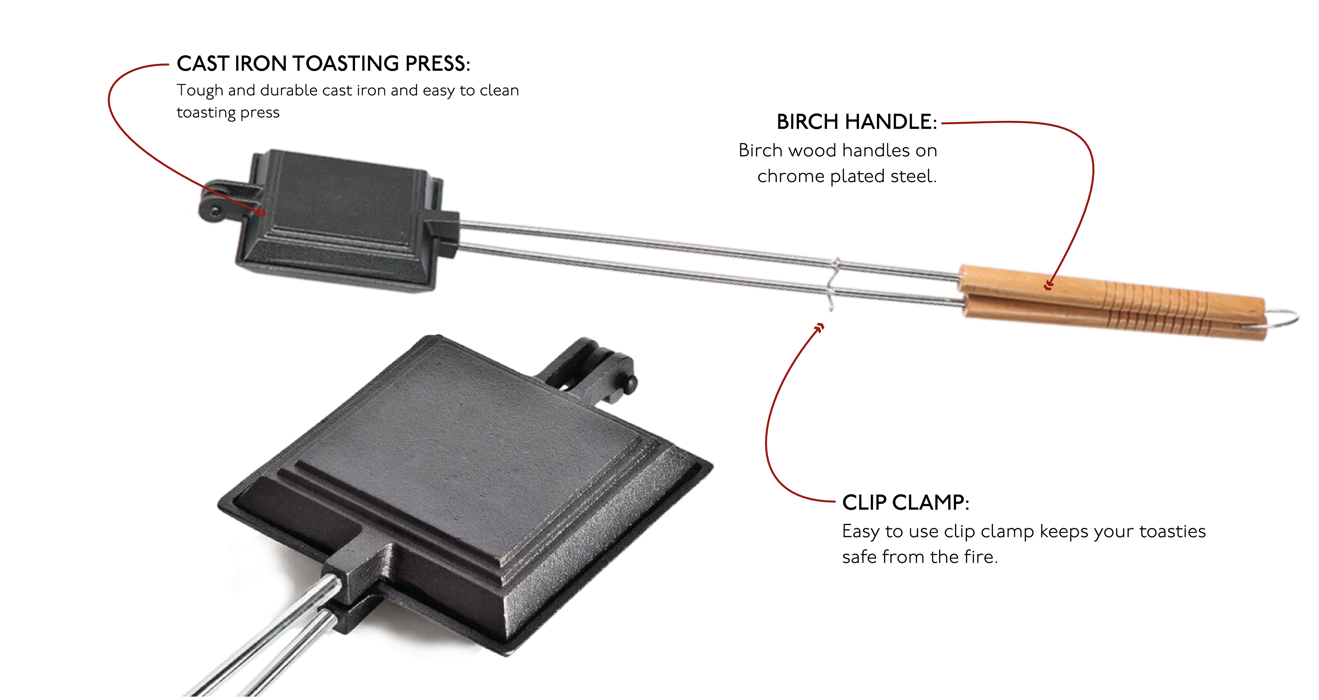 Leftovers with cheese, apricot with cinnamon and sugar, marshmallows, banana & chocolate or just simple bacon and egg… You can even replace the bread with pastry! It makes campfire cooking simple, fun and super tasty.
