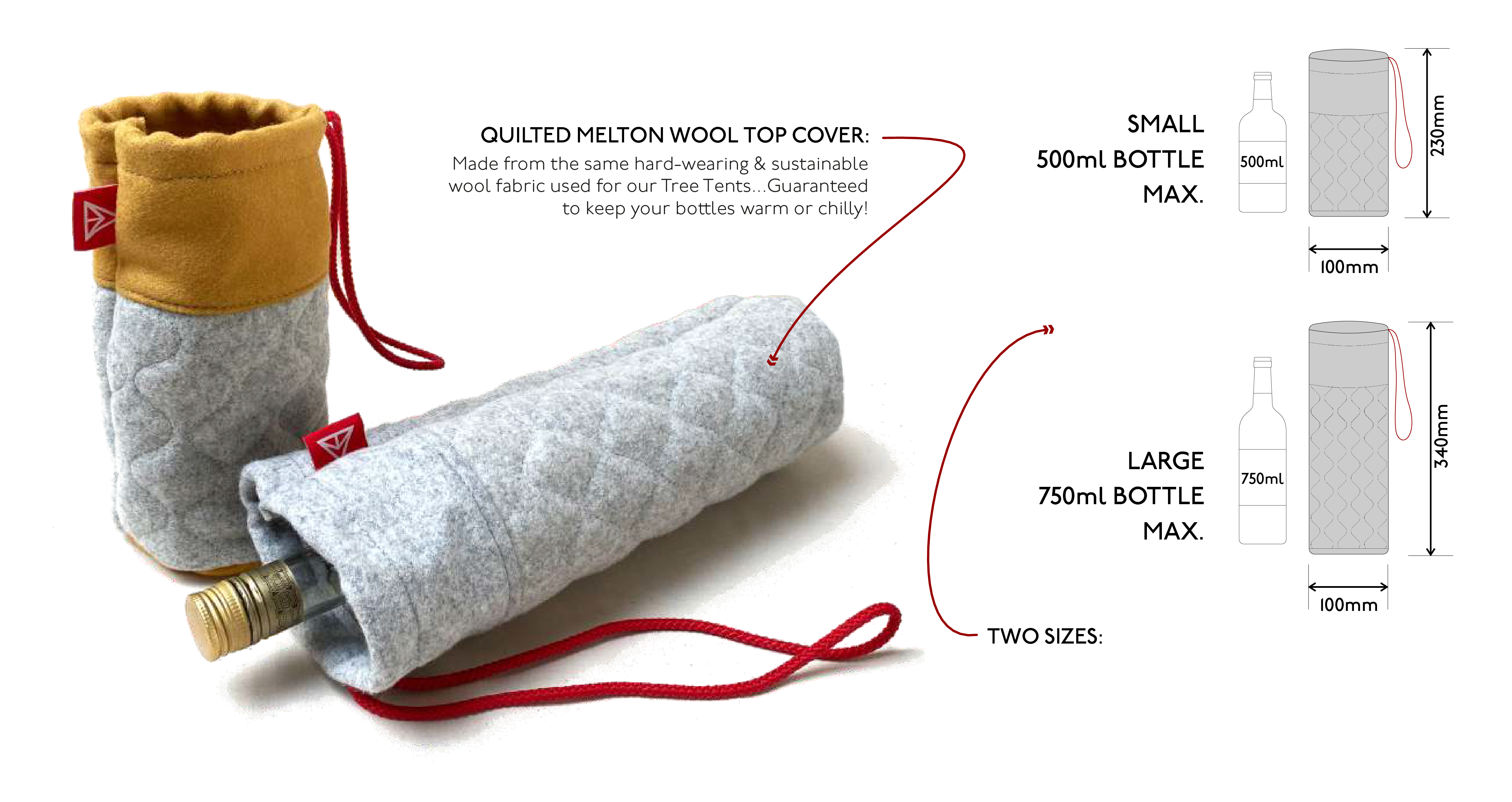 Crafted from 100% Melton wool, left over after creation of the interior insulation of our Tree Tent! These bottle covers are a perfect way to keep your drinks safe and at an even temperature.